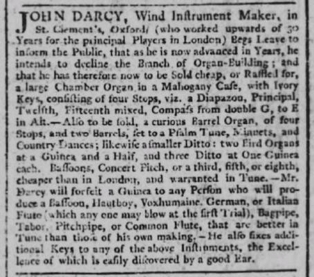 There are lots of things in here worth discussing! Not least is the reference to John Darcy being a maker of barrel organs that can play Psalm tunes, minuets and Country dances – Paul Roberts mentioned one of these in one of his papers on English fiddle music.