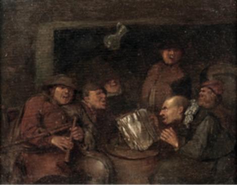 The painting has a very clear depiction of the chanter and drones. The drones appear to be slightly more splayed than the engraving but the chanter looks very similar with the extra detail of metal or horn work on the bell of the chanter and the chanter top. Could be an offset right hand little finger hole plus some vent holes on the bell of the chanter. Overall, the composition is very similar with only the heads of the characters changed. This image is from an auction house archive so the original could be larger. Great image though!