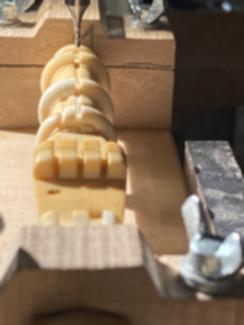 Unfortunately, the four damaged key blocks could not be saved. To make a functional instrument you need a solid base to start from. We decided to remove the broken parts completely using a flute mill and dovetail mill, and then inserted a new piece of pre-convention ivory. The dovetail joint makes a sturdy connection with the old instrument. Where the ivory is very thin, I inserted a 0.9mm ivory rod as reinforcement. A bit of thin superglue holds everything in place. After careful filing, turning and sanding, I milled the grooves for the keys, and drilled the holes for the axles.