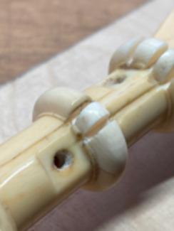 For the other parts, it was just like making a new musette. Instead of making a complete instrument out of ivory, like they usually did in the 18th century, I tried to use as little ivory as possible. For the drone, stocks and portevent (connection between bag and bellows) I used FSC African Blackwood from Tanzania (supplied by Sound And Fair) I then added a few ornamental ivory rings, all made from pre-cconvention ivory, with the necessary paperwork. The design is based on the signed Chédeville musette in the MIM in Brussels. Instead of the more traditional 6 key petit chalumeau, I chose for an 8 key model. This allows the musician to play a high e flat and e, combine the keys and you hear an f.