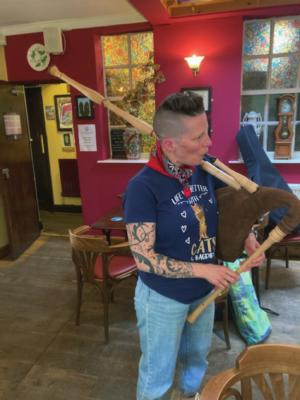 set, named Humperdoo, from Jim Parr. He is an absolute bruiser (the pipes, not Jim). I took delivery of these pipes Easter 2022. He too is a handful because he’s rather on the large side, quite a chunkybutt, and requires confident playing. He too took me a while to get the hang of. I had promised myself rather naively that I would learn to play Humperdoo while my partner was having/recovering from surgery after a cancer diagnosis. Well that just didn’t happen, unsurprisingly, but