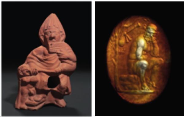 There are no known depictions of bagpipes from the classical Greek period (8th century BC – 323 BC). We can see avlos, lyra, cympal on numerous terracotta and murals but no bagpipes. The first artifacts implying its presence are from the Hellenistic period (323-146 BC) and are found in Alexandria, in what used to be the Kingdom of Ptolemeus, today’s Egypt. It is a terracotta figure of a sitting musician [2] and and a carved gem [3].