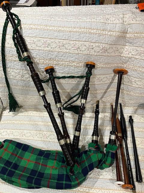 Drones plus blackwood chanter or Shepherd plastic chanter, outer bag and carry case, plus brand new cord, but no inner pipe bag.